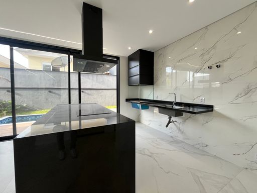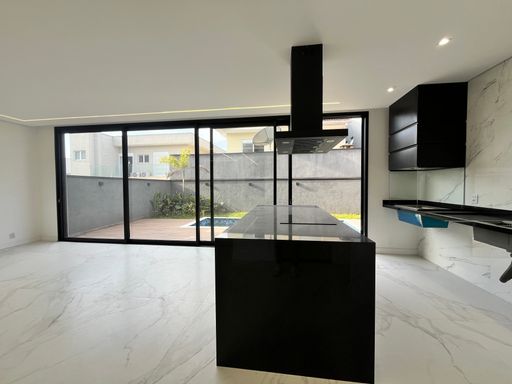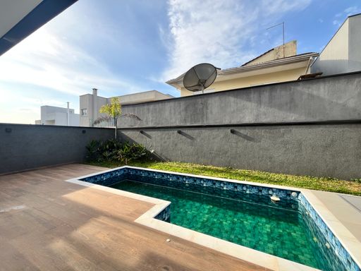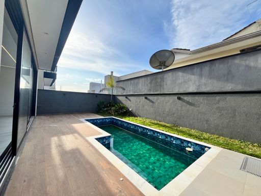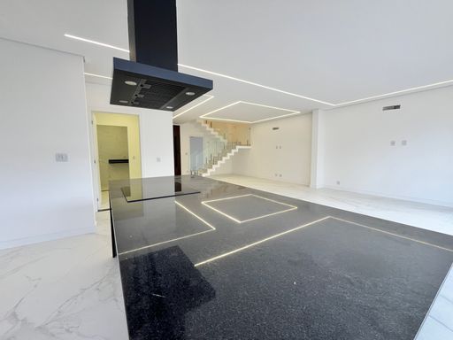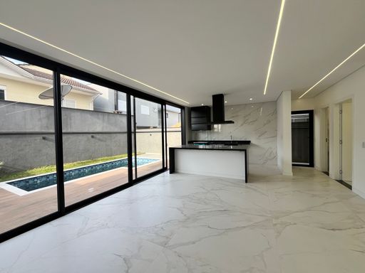 No piso térreo, o imóvel conta com sala de estar e jantar integradas, cozinha com área gourmet, despensa, banheiro e lavanderia. No piso superior, são quatro suítes com varanda. O sobrado ainda possui piscina e quatro vagas de garagem, sendo duas cobertas.