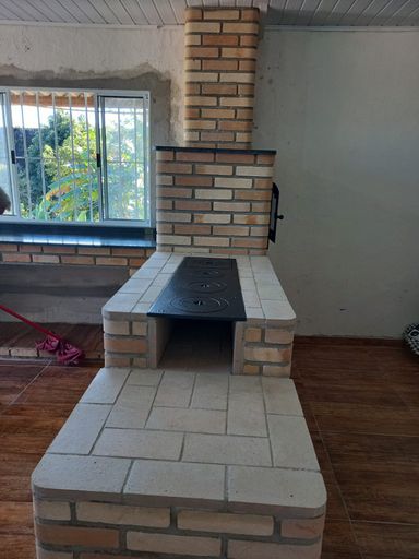 Cozinha conjugada com área de forno e fogão à lenha