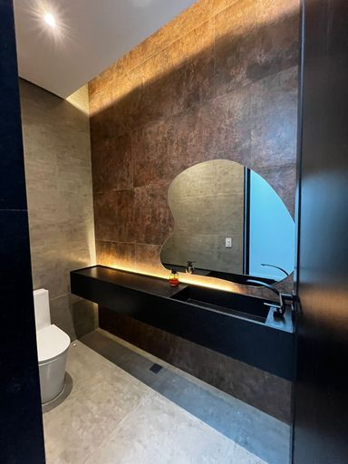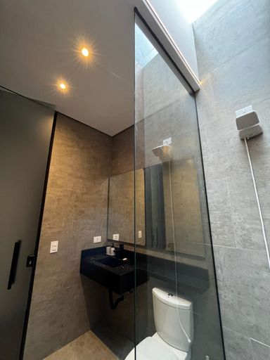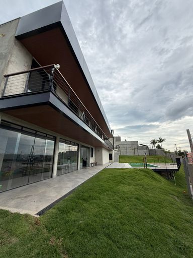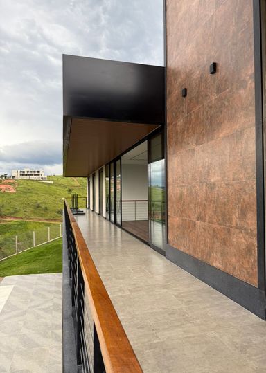 Imóvel totalmente arejado, com ventilação natural, iluminação em LED, esquadrias em alumínio preto, vidros com pé-direito elevado e infraestrutura completa para ar-condicionado. Acesso por portão basculante automatizado, rampa para garagem aberta de 100 m² e área construída total (casa + garagem coberta) de 345 m², com portas internas de pé-direito alto que reforçam a imponência dos ambientes.