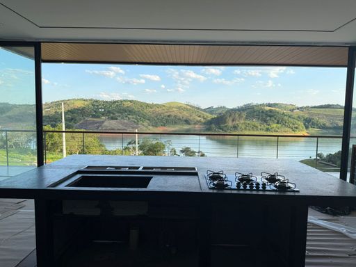 Área social integrada com lavabo, cozinha moderna com ilha em mármore preto escovado e vista para a represa, sala de TV aconchegante no mesmo ambiente, despensa, lavanderia com teto retrátil e corredor com claraboia proporcionando iluminação natural. Todas as bancadas em mármore preto escovado.