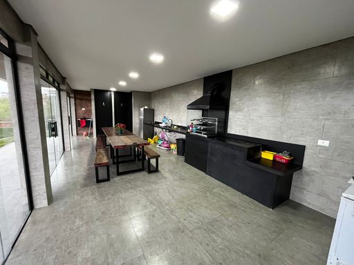 Lazer completo com espaço gourmet equipado com churrasqueira e forno a lenha, banheiros masculino e feminino, ducha externa, jardim com árvores frutíferas, piscina 8x3 m com bordas em mármore, prainha, aquecimento por trocador de calor inverter, amplo deck de madeira 10x4 m e quadra de futebol 8x10 m. Conta ainda com poço artesiano de 110 metros, vazão aproximada de 5.000 litros/hora.