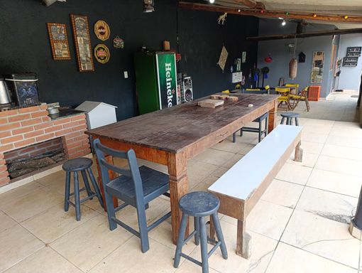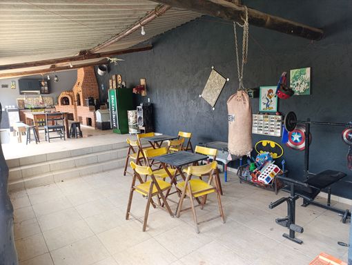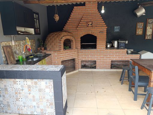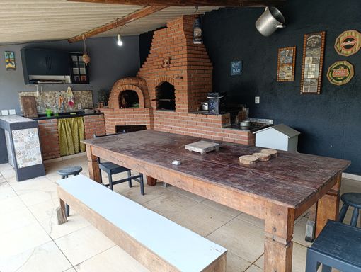 Salão de festas, churrasqueira, fogão a lenha e forno de pizza