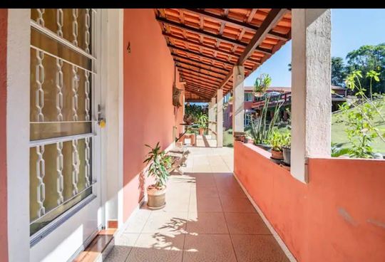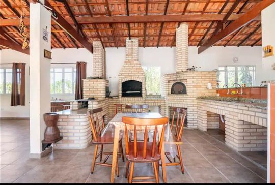 A casa possui estilo pousada, com sete suítes, cozinha, varanda em toda a extensão e acabamento completo.