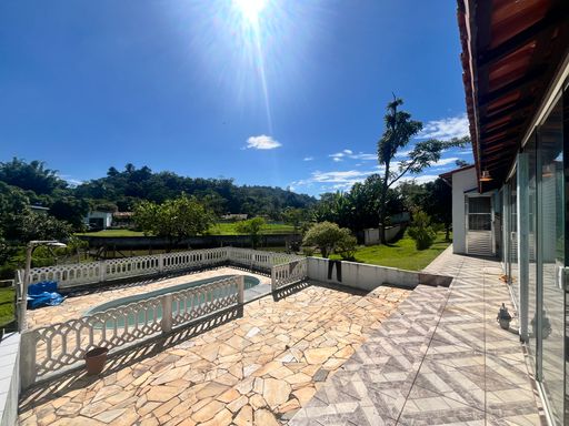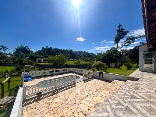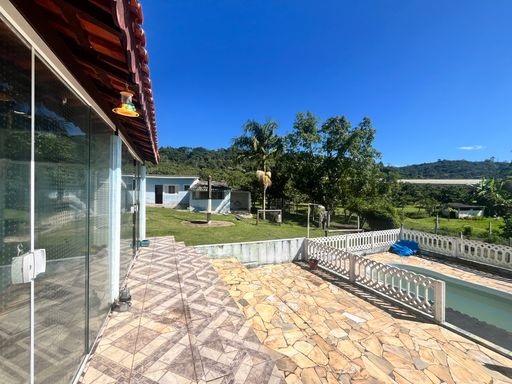 A propriedade conta com ampla área de lazer, composta por piscina, churrasqueira, forno e fogão a lenha, além de espaço para festas.