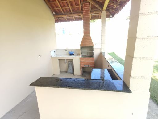 A casa conta com dois dormitórios, sala, cozinha, banheiro, varanda e piscina grande com hidromassagem. O acabamento inclui detalhes em pedra sabão.